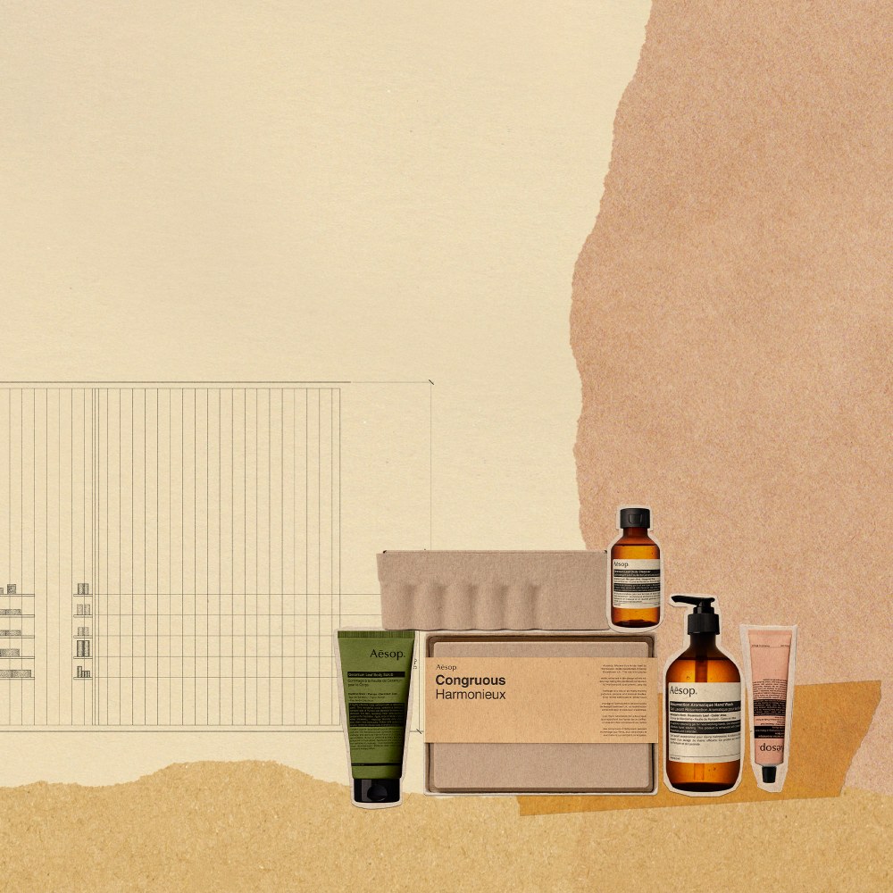Congruous:Comprehensive Care For Hand(街景合奏),提供手部及身体全面保养──呵护从颈部至脚底的全身肌肤;其外包装纸盒灵感来自 Aesop 洛杉矶市中心店的管状设计;Precipitous:A Parsley Seed Skin Care Trio(城市蓝图),灵感来自香港 Aesop 新城市广场店。适合每天使用的肌肤健康配方,专为都会生活研发而成;精心收藏于设计纸浆礼盒中,其包装灵感借鉴了 Aesop 新城市广场店的钢网结构。