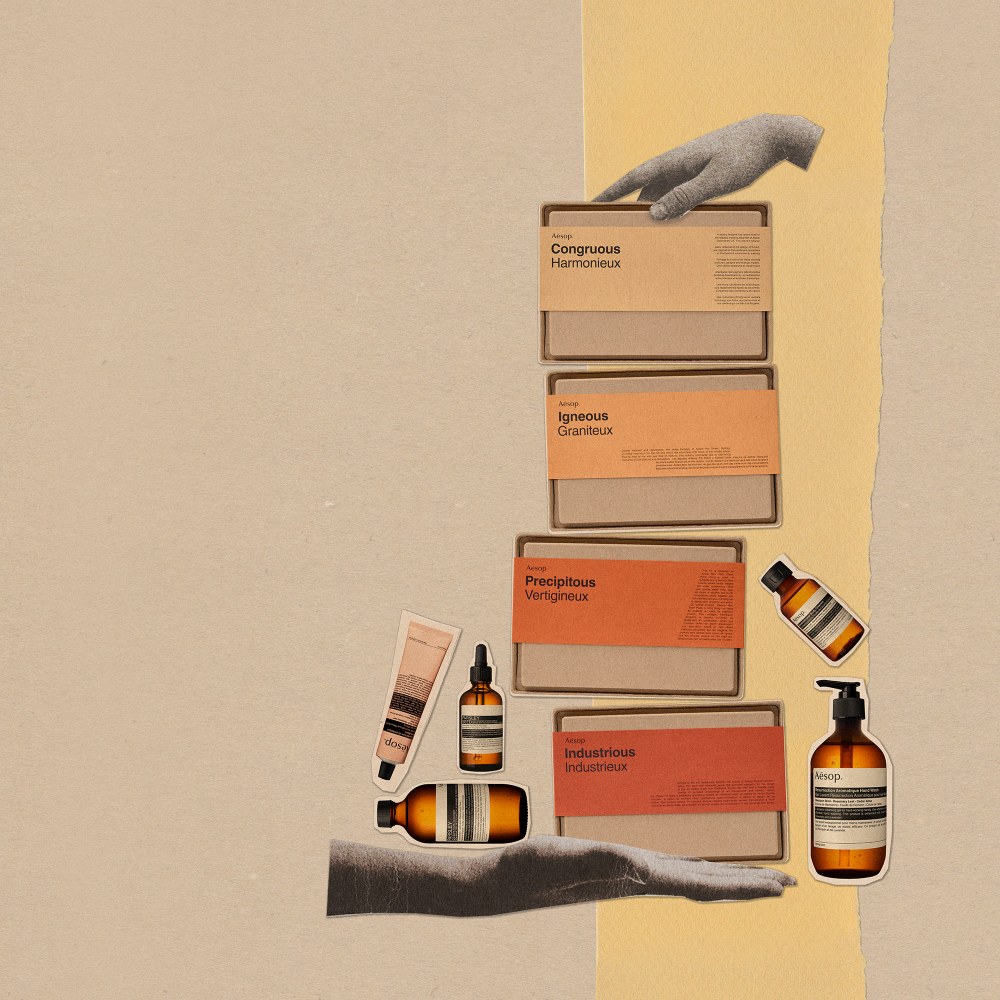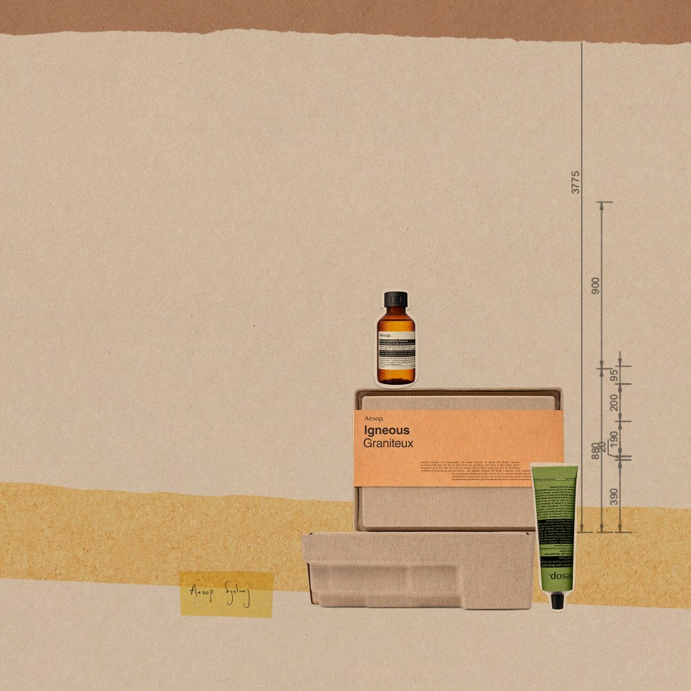其中Igneous:A Geranium Leaf Body Care Duo(山岩漫步),灵感来自 Aesop 悉尼皮特街店。注入活力的身体保养二件组,打造无暇洁净、柔软保湿的肌肤;其礼盒包装设计旨在向 Aesop 雪梨皮特街店的铺石外墙致意。Industrious:Hand Care in 3 Acts(砖瓦绿洲),灵感来自首尔 Aesop 汉南洞店。手部保养三部曲──保持双手无暇洁净、完美保湿──其外包装纸盒设计灵感来自 Aesop 首尔汉南洞店。