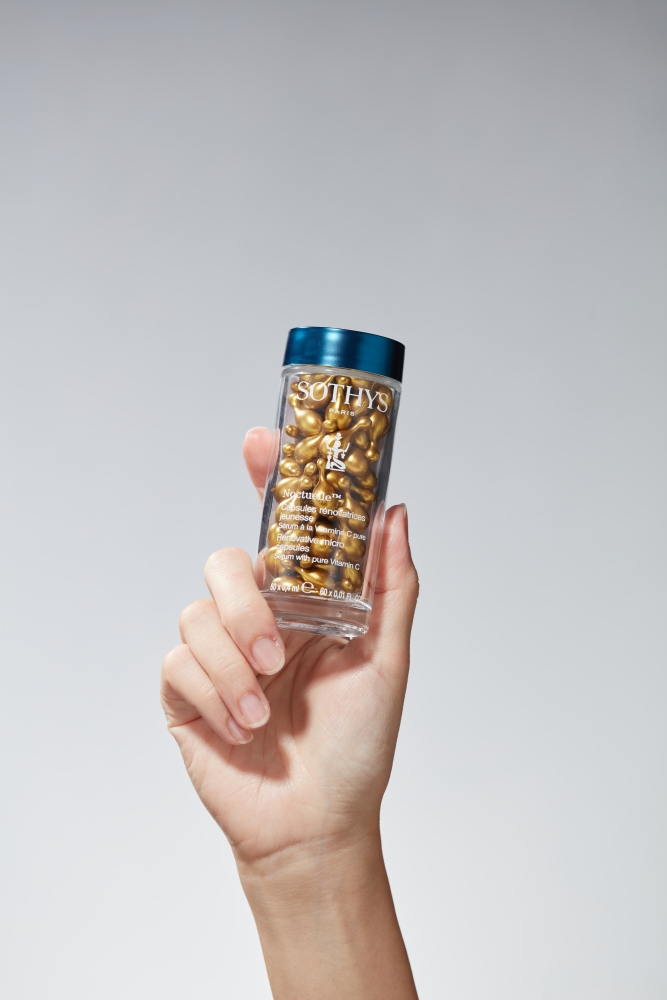 Sothys Noctuelle Vit-C纯精华素被誉为是「黄金C胶囊」,每一颗微囊里承载了20%高浓度纯维生素C,于夜晚的黄金修复期为肌肤提高光泽度、弹润紧肤、均色淡斑、平滑细纹,激活胶原蛋白生成、逆转衰老痕迹,缔造透亮紧实的肌肤。独特的微囊采用了对环境友善,100%完全生物降解的植物性材料制成。