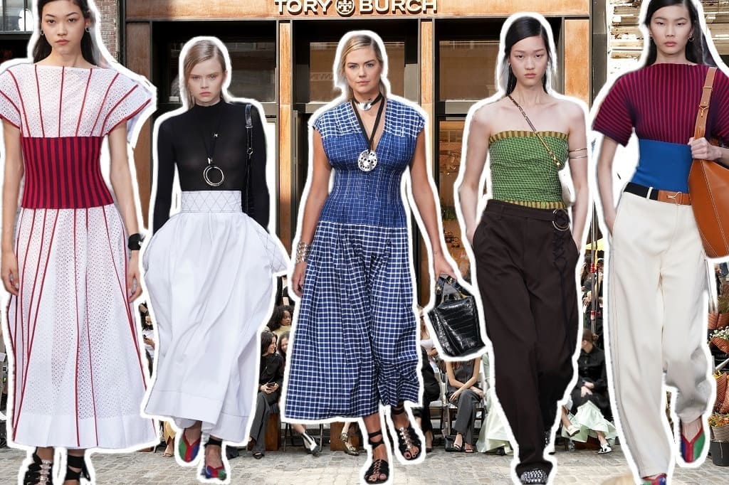 这场大秀选择品牌位于纽约甫开幕的旗舰店前举办,除了封街,品牌还将街道打造成了颇具乡野氛围的早市,从整体概念,你就已知这次的设计主题。而且,这场秀的设计,也是Tory Burch对开创美式风格时装设计师Claire McCardell的致敬。