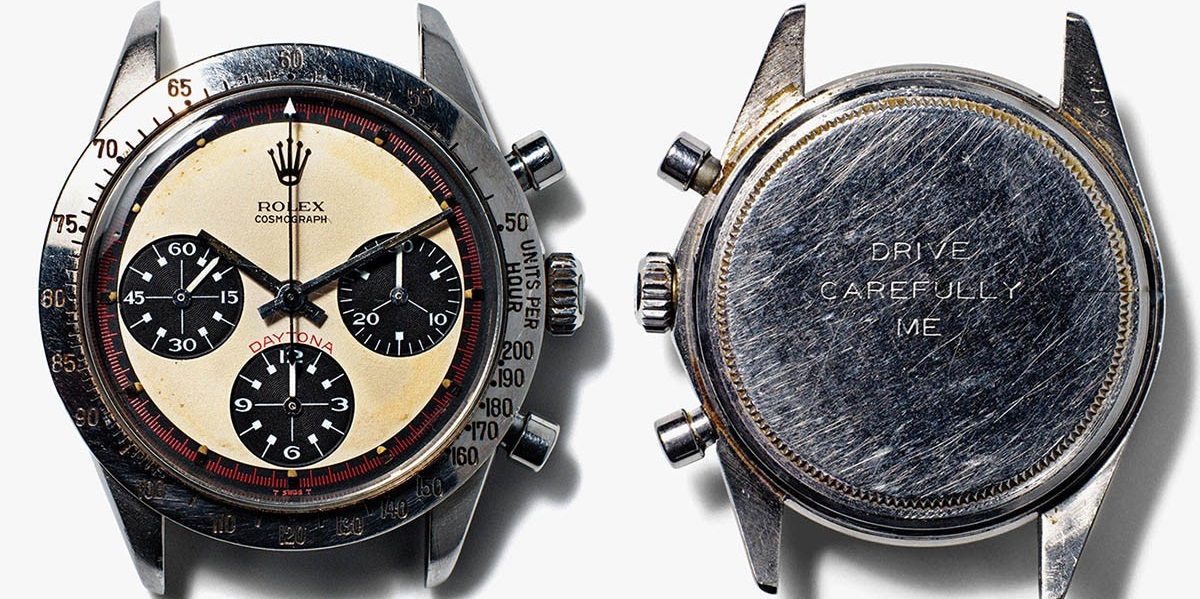 此表大有来头,是劳力士迷都会认识的 Paul Newman 的个人珍藏,亦是其爱妻于1983年结婚25周年送给他的礼物,底蓋刻有叮囑他小心駕車的「Drive slowly Joanne」字样。此表是他当年常戴的腕表之一,出现在不少他的照片里。