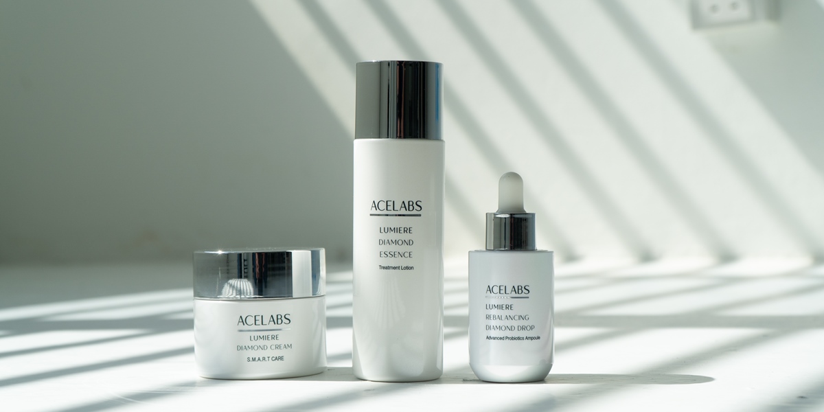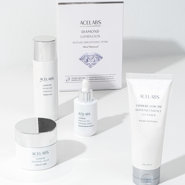 全新 ACELABS 钻石亮白产品一共有 5 款单品:Lumiere Rebalancing Diamond Drop 速效精华、Lumiere Low PH Diamond Essence Cleanser 洁面霜、Lumiere Diamond Essence 精华、 Lumiere Diamond Cream 乳霜、Lumiere Diamond Luminous Intense Brightening Mask 面膜。从保湿到修复层层递进,为肌肤提供充分的营养!除了钻石粉末,此系列更加入了酶、矿物质以及益生菌等生物活性成分,其中人气单品 Lumiere Rebalancing Diamond Drop更主打14天内让肌肤变得更透亮弹Q、饱满润湿。