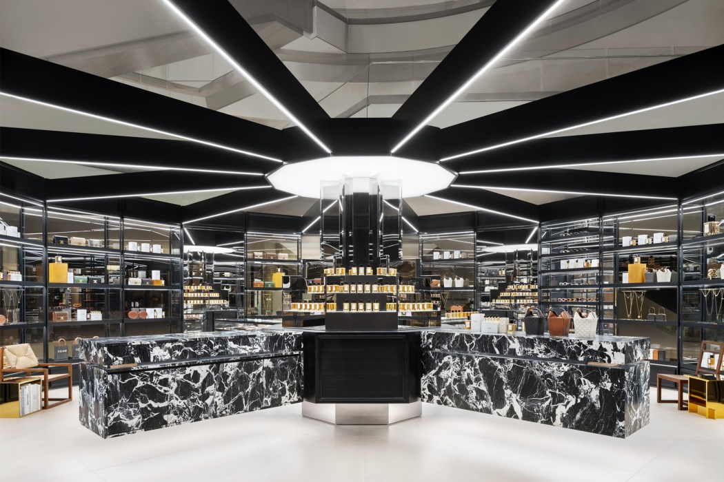 此Celine Pop-Up快闪店设计风格延续了品牌向来热衷的雅致和简约风格,以大理石纹作为展示台,而多角形的外围则是以透视玻璃贯穿。快闪店除了展示品牌全新包款、配件、皮件系列外,同时也展示了品牌在数月前正式在马来西亚上架的 Celine高定香水系列。