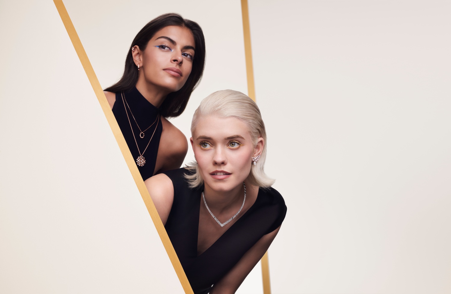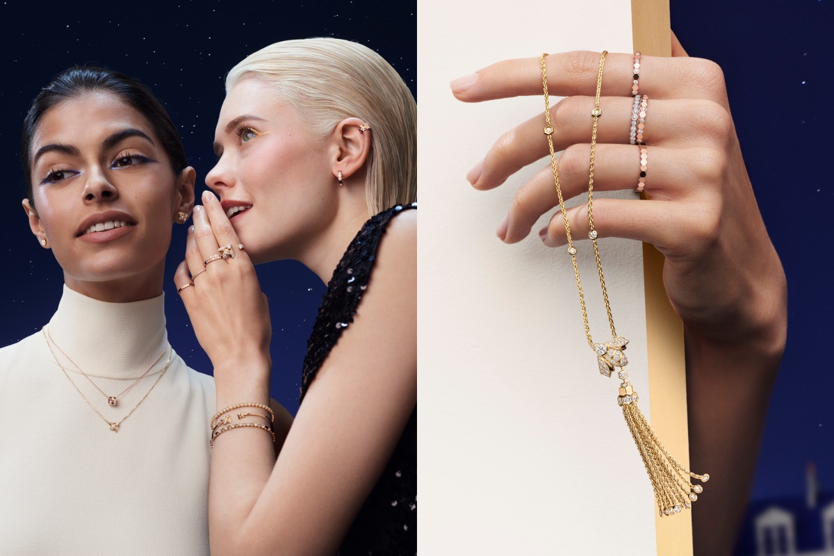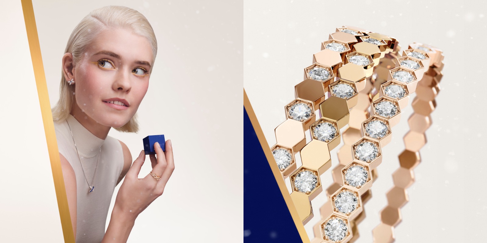 铺镶钻石的蜜蜂更现身于 toi et moi 双戒与流苏长项链之上,细密的金链汇聚成灵动的垂坠感,轻盈又耀眼。蜂巢的几何美学延伸至镂空吊坠,交错闪耀的钻石与镜面黄金彼此呼应。系列中还包括可叠戴的手镯与戒指——无论是玫瑰金、白金或黄金款,铺镶、半铺镶或镜面光泽,皆能随心混搭,展现独一无二的风格。全新玫瑰金圆环耳环则以极致光辉衬托面庞,为造型添上一抹摩登亮彩。