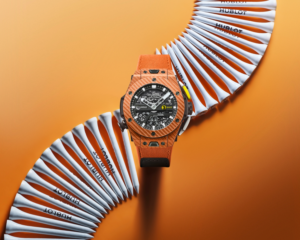 这款腕表特别为高尔夫球运动而设。新表独特之处用上碳纤维加橙色Txalium 物料,制作表壳及表圈,颜色又抢眼又有新鲜感。腕表直径45mm,配半镂空表盘及橙色小牛皮带饰有黑色橡胶配碳纤维纹理装饰,上面更印有「HUBLOT」字样。腕表可通过三个视窗分别显示高尔夫球玩家的当前洞数、该洞的杆数以及本回合的总杆数。按2时位的推杆形按钮一下,4时位的杆数计算器便会累计杆数。