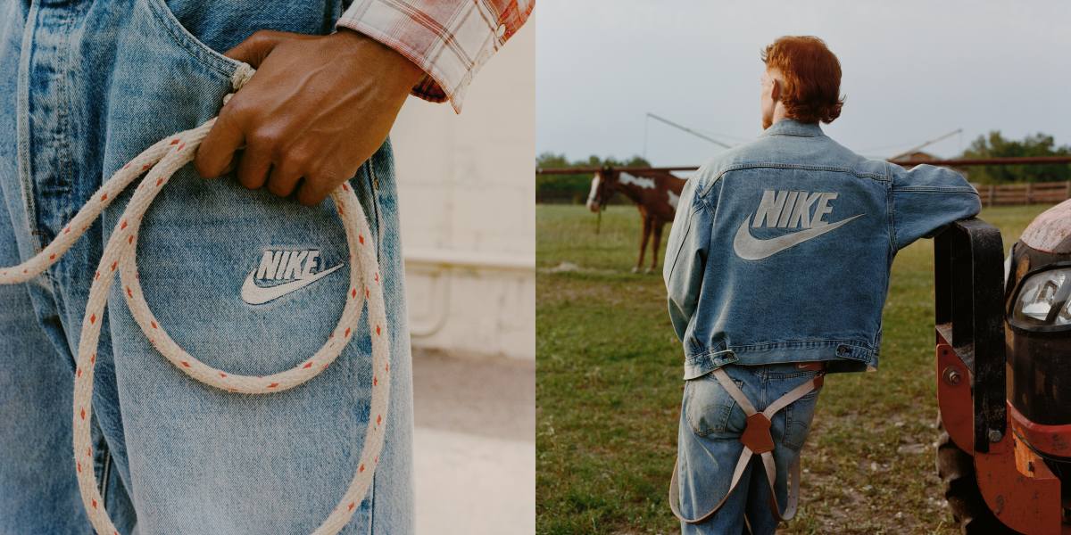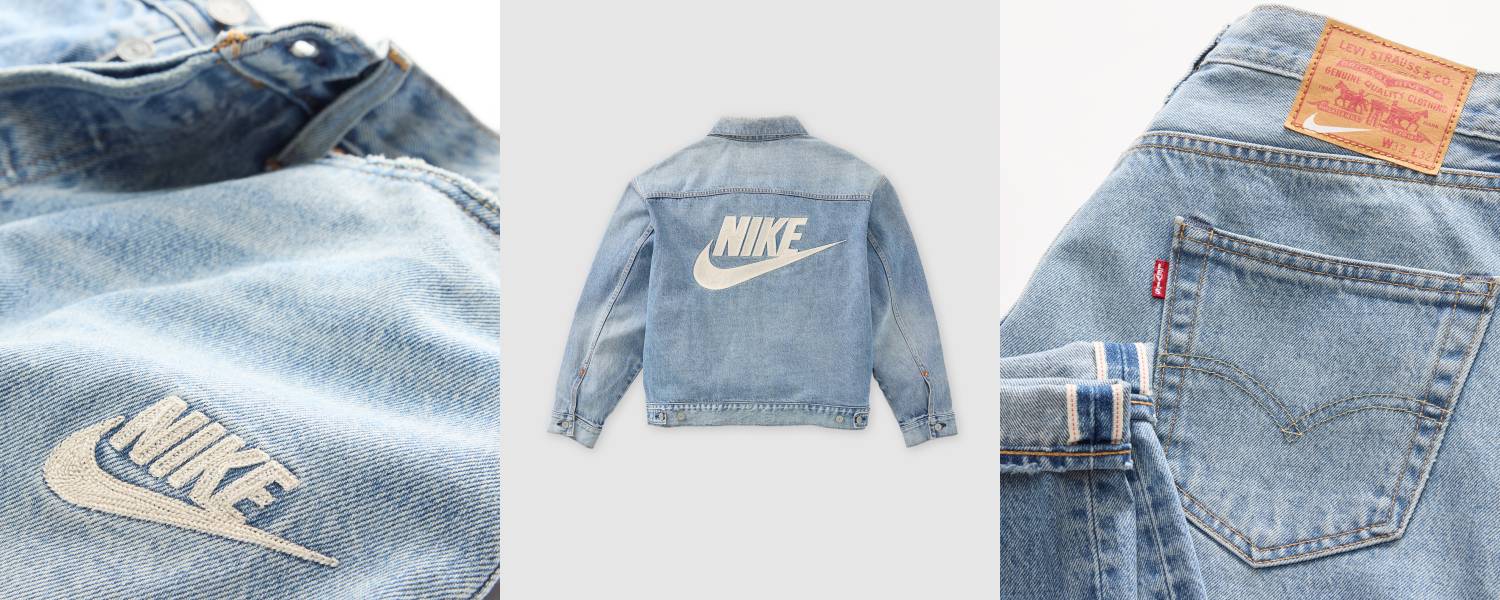 系列核心单品包括 Trucker Jacket 和 Baggy Jean 两件服饰,采用中浅水洗牛仔布,并以米白色链式缝线与皮革贴片点缀。最吸睛的是传统 Levi’s® 红旗标被 Nike Swoosh 替代,显得特别有“混血感”。Trucker Jacket 延续 Type II 的结构,而宽版牛仔裤则专为搭配球鞋打造,裤脚线条配合叠穿设计,在街头氛围中带点复古味。