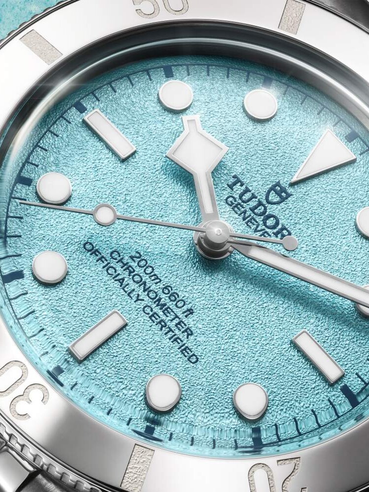 - 臻美款:全新“天际蓝Celestial Blue”珍珠母贝表盘,点缀 14 颗钻石时标,搭配渐变色调的 48 颗蓝宝石表圈,呈现星空般的光影盛宴。
