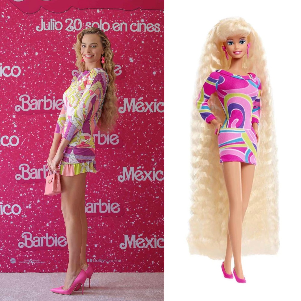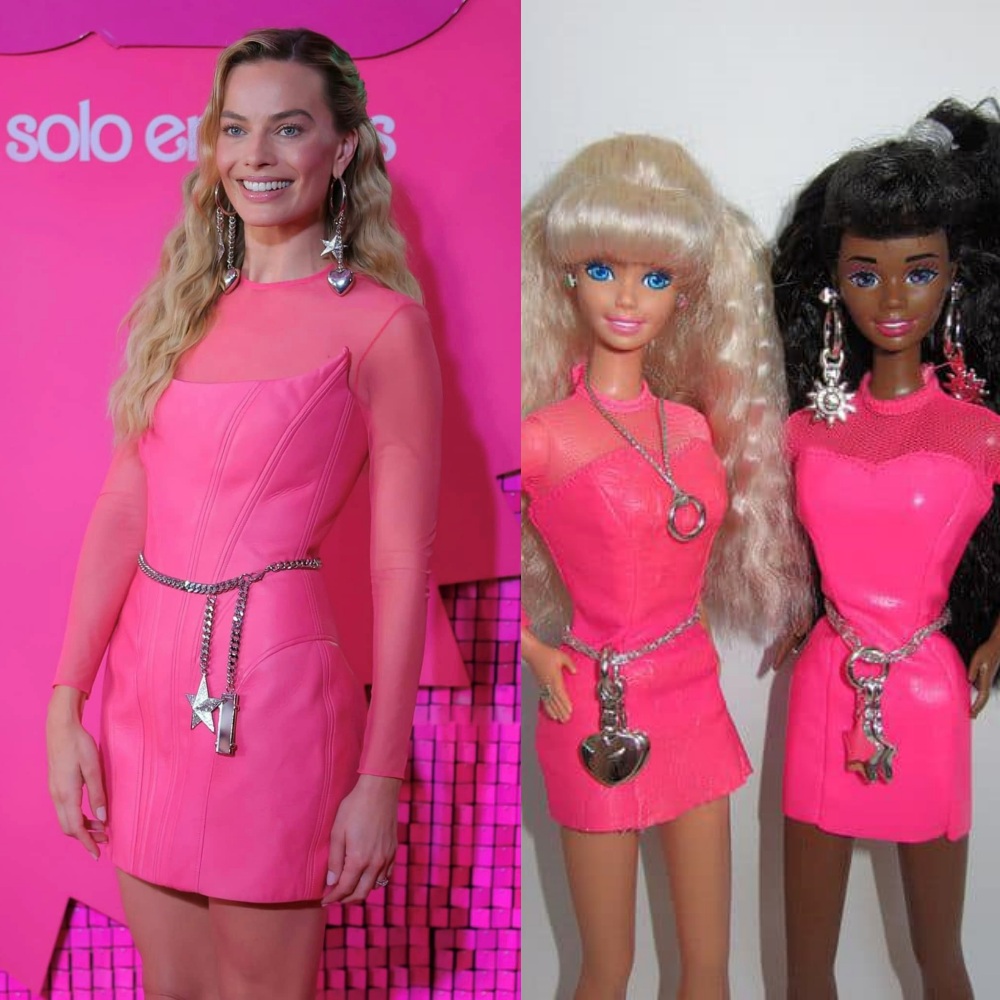 Margot Robbie 到墨西哥出席首映典礼时,穿的是 Balmain 订制礼服。这套是致敬1992年的Earring Magic Barbie,用心程度你看到了吧?
