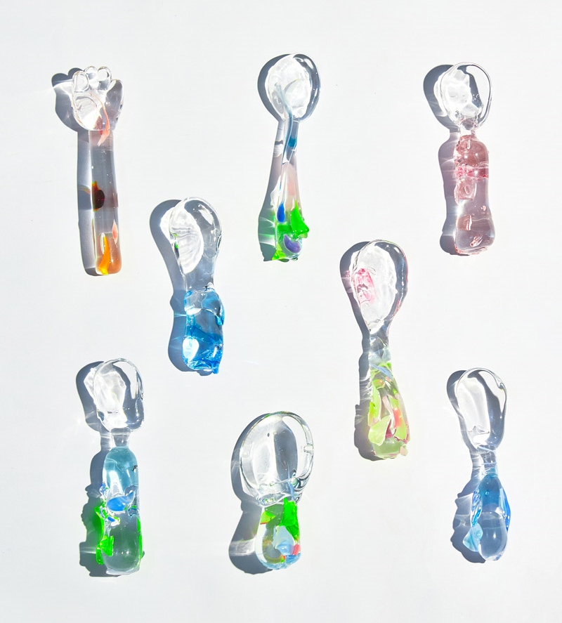 Miwa Ito 以台湾特色美食小笼包为发想,设计小笼包造型的花瓶,让各式可爱的小花朵能点缀放置在小笼包头上,不仅实用且相当疗愈、可爱。此外,她也特别为快闪活动首度尝试设计玻璃汤匙制品,汤柄上的玻离彩色纹路是采用在玻璃吹制过程中,通常会被丢弃的彩色玻璃碎片进一步加工设计而成,透过Miwa的创意发想,赋予物品再生的生命力。