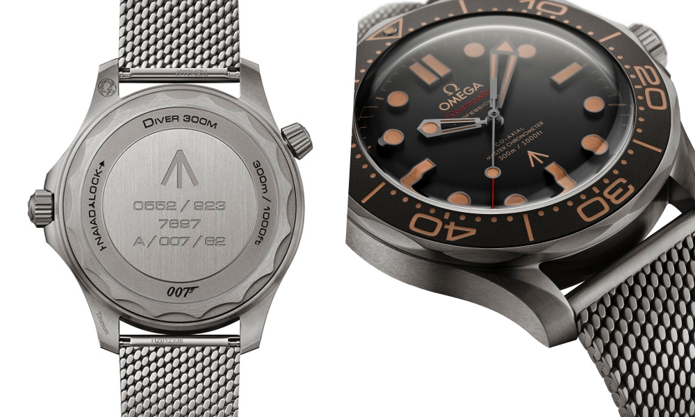 直径42mm的表壳采用钛金属制成,轻盈而坚实,10点钟位置的手动排氧阀门,必定能够协助完成水中任务。表盘6点钟位置的阔箭标志,常见于军事设备,用以标示英国政府财产,呼应了007的特务身份。腕表搭载8800同轴擒纵自动上链机芯,获得大师天文台认证,提供55小时动力储存。实心表盖上的编号也藏有彩蛋,个中含义分别如下:“0552”为海军人员代号、“923 7697”为潜水表代号、“A”为旋入式表冠代号、“007”则无需赘述、“62”则是象征第一部007电影上映年份。