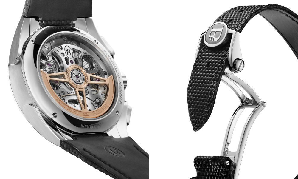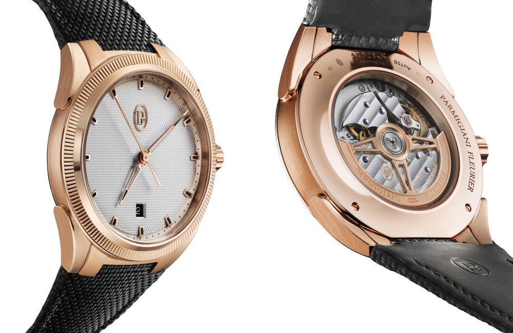 和所有 PARMIGIANI FLEURIER 的自制机芯一样,这两款机芯及其所有零部件均在品牌的制表工坊中设计、生产和组装。透过蓝宝石表背,即可欣赏机芯精美绝伦的手工装饰工艺,倒角打磨和日内瓦条纹装饰优雅精妙,机芯还配备了品牌标志性的22K玫瑰金镂空摆陀。