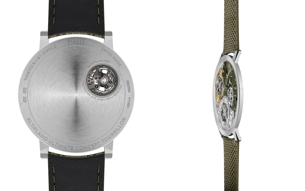 继2024年推出 Altiplano Ultimate Concept Tourbillon 腕表150周年纪念版后,PIAGET再推新作,呈现卡其绿与黄金色调的组合。腕表的钴合金表壳延续了前作厚度仅2.0毫米的超薄设计。PIAGET始终坚信:技术创新并非终点,而是抵达美学纯粹之境的桥梁。超薄制表技艺的应用,只为彰显优雅美感,将机械构造浑然融入美学设计中。全新 Altiplano Ultimate Concept Tourbillon 腕表中,表壳与机芯融为一体,每一处细节均秉承同样一丝不苟的精准度打造。表底盖同时兼作机芯的主夹板,巧妙的一体式设计确保每一寸空间均得以充分利用,彰显出PIAGET对于超薄设计的不渝追求。
