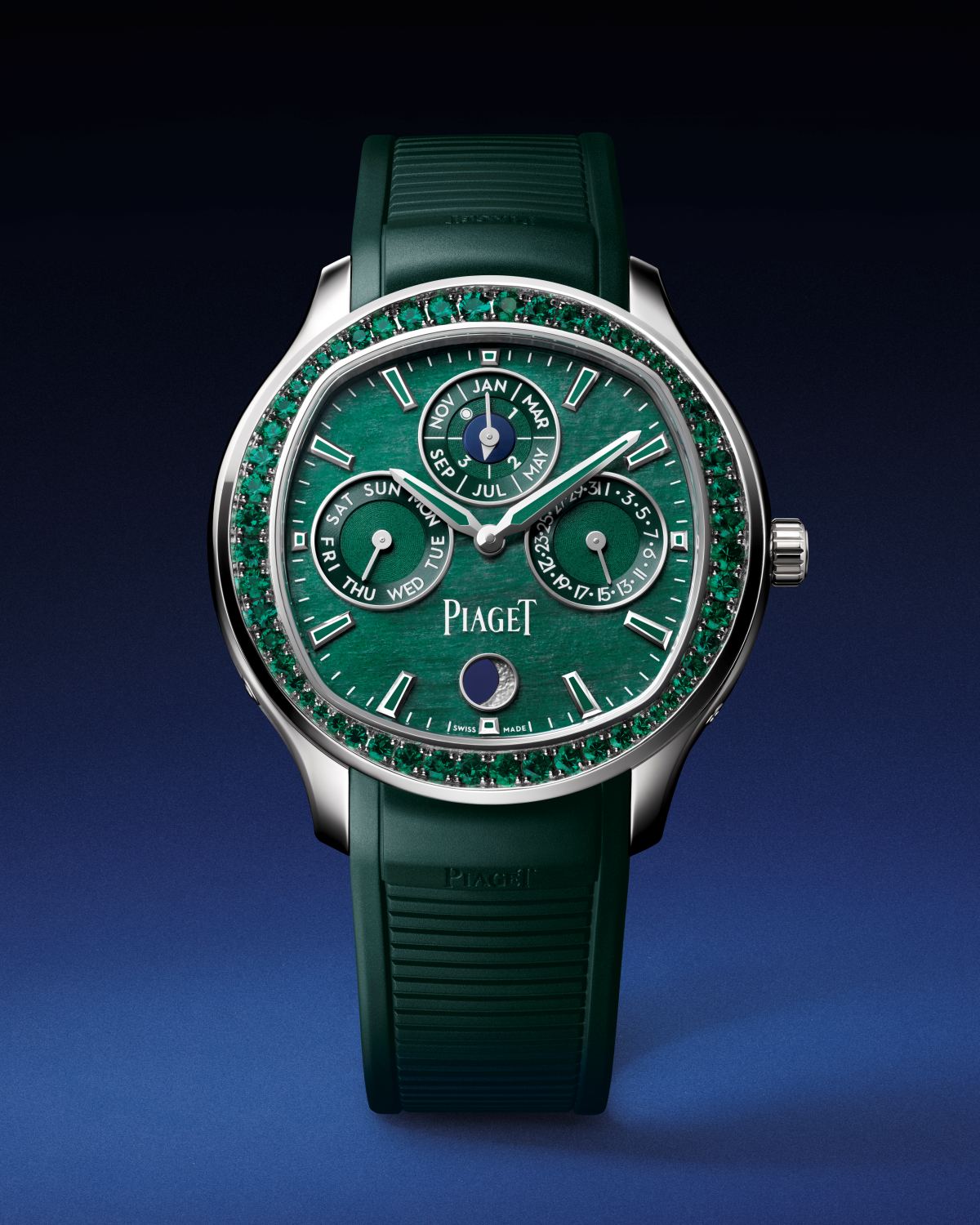 此次,PIAGET Polo系列万年历表款以两款各具巧思的新作,演绎腕间多元新意。其中,蓝色黑曜石款腕表呈现更加低调内敛的美学风格。优雅简约的超薄表壳经抛光与缎面打磨交替处理,表盘采用的蓝色装饰宝石巧妙呼应PIAGET伯爵标志性蓝色调,搭配同色系的蓝色橡胶表带,于细节处彰显大胆巧思。绿色黑耀石款腕表则以宝石的瑰丽华彩,演绎时光之美。这款腕表限量仅18枚,每一枚皆有独立编号。表圈环绕镶饰56颗明亮式切割祖母绿,巧妙勾勒出万年历复杂功能的精妙布局。