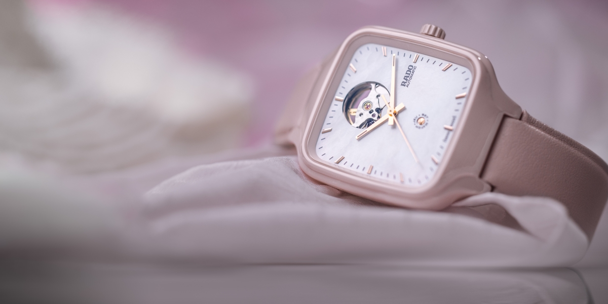 这款腕表采用浅玫瑰色的高科技陶瓷方型表壳;白色珍珠母贝表盘搭配玫瑰金色的时标,赋予腕表奢华之感、镂空设计提供迷人视角 欣赏腕表机械脉动之余,亦能让人想起卓越外观背后的匠心。拥有防眩目涂层的平面蓝宝石玻璃表镜,为搭载 80 小时动力储存的Rado R734 自动机械机芯提供保护。腕表同时配有 NivachronTM防磁游丝,可保护机芯不受磁场影响以提高计时可靠性。