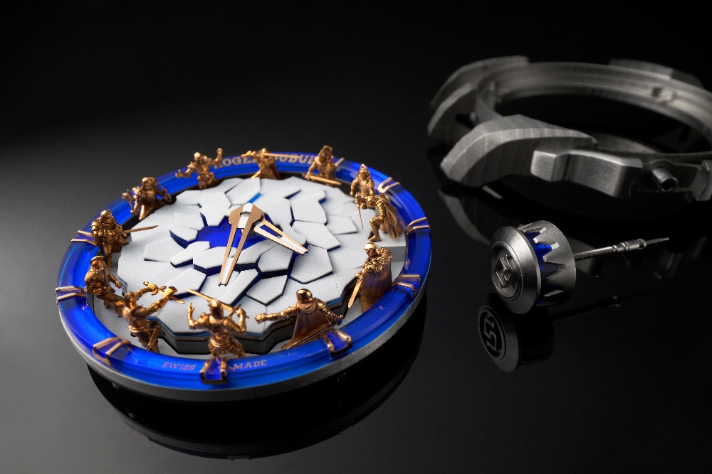 虽然时计整体以中世纪传说作为灵感驱动,但却是采用现代技法与材质制作而成。钛金属材质为这款腕表赋予奢华气息与现代感特质,而大马士革锻造方法让它更显与众不同。