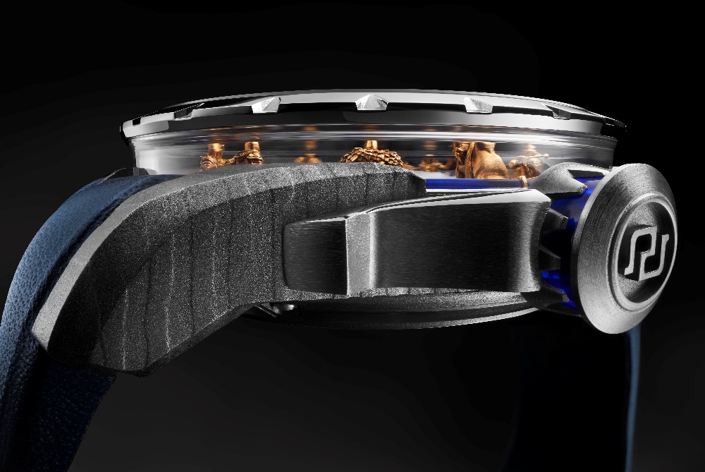 腕表的表带采用深蓝色,集舒适体验、亮眼色彩和大胆前卫的多功能性于一身。表带采用快拆装置,便于佩戴者快速更换表带,打造个性腕表。