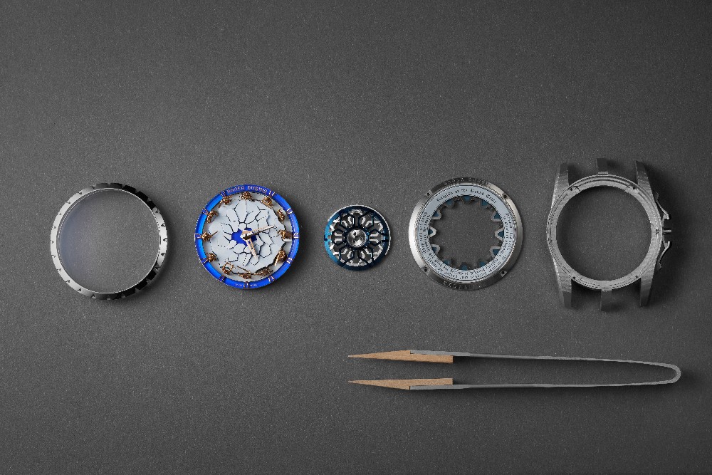Roger Dubuis 将整个场景尽收于表盘外侧凸缘内,以经穆拉诺工艺制造的透明冰蓝色玻璃制作环圈,这一精准色调历经6个月的深入研究和试验才得以打造出,令腕表呈现出澄澈迷人的生机与活力。