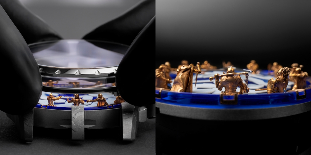 要制作出如此栩栩如生的微雕骑士,需遵循一整套精密细致的工艺流程。首先是绘制图纸,以完美比例勾勒出所有骑士的树脂模型,然后进行3D扫描。最后再以18K玫瑰金进行铸模和浇铸,令6毫米高的微雕骑士跃然呈现。最后还需要靠工匠大师的精雕细琢,每位骑士铸像需耗时一至三天方可完成。
