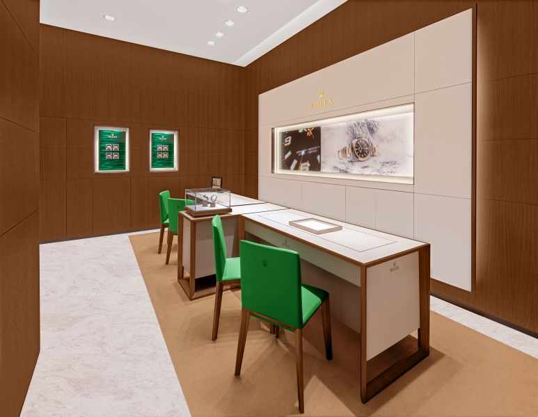 旗舰店占地134 平方米,室内设计师更善用了灯光凸显腕表美感,同时摆设再精致的陈列柜中,内衬米色皮革并饰有青铜饰边。醒目的祖母绿水色作为品牌的主色系,以及波浪图案借鉴了世界上第一款防水腕表标志性的 Oyster适当的出现在旗舰店周围,营造出协调清新的调色板的色调。