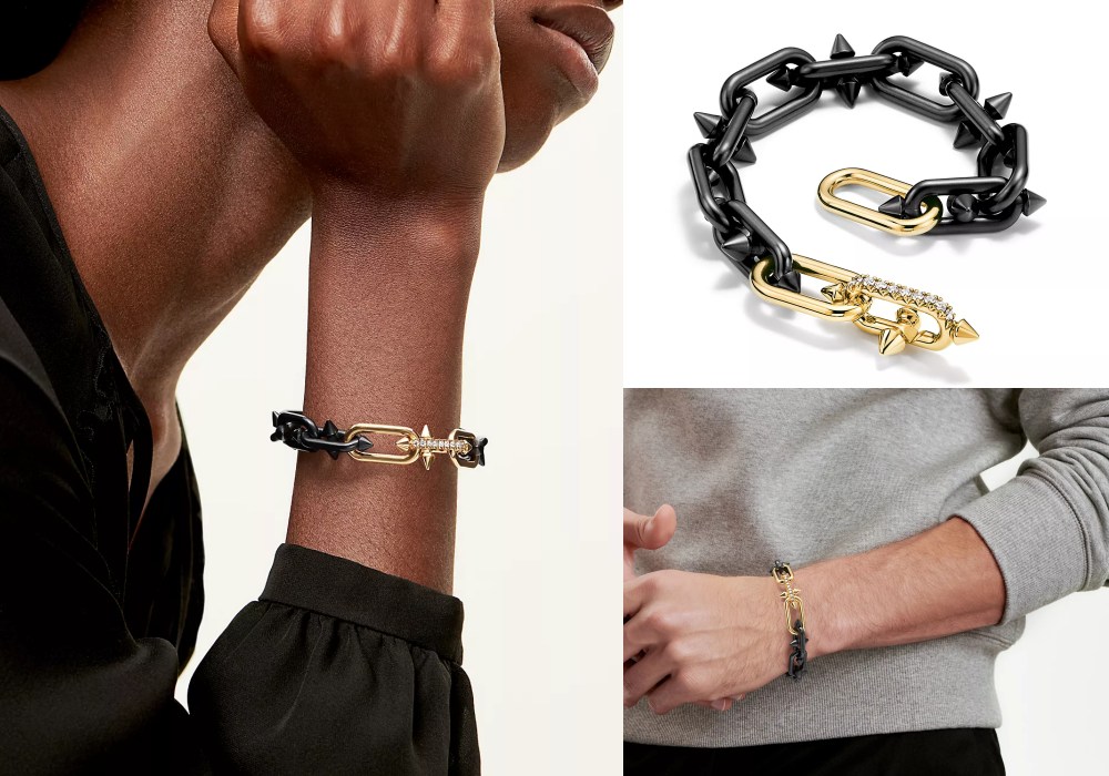 使用的黑钛金属材质本身柔和的反光特性和黄金形成鲜明对比,达到了让人一眼难忘的效果。再来是密镶钻石,新系列也对传统钻石镶嵌方式进行了意想不到的改造,采用反向镶嵌钻石,露出钻石的亭部,最大限度地展现钻石的光芒。系列中的每款设计均采用精准技术,与佩戴者的每一个动作结合,展现了品牌对完美工艺的承诺。Y编最喜欢的是每一款设计都是男女适戴,契合现代的多样性与包容性。