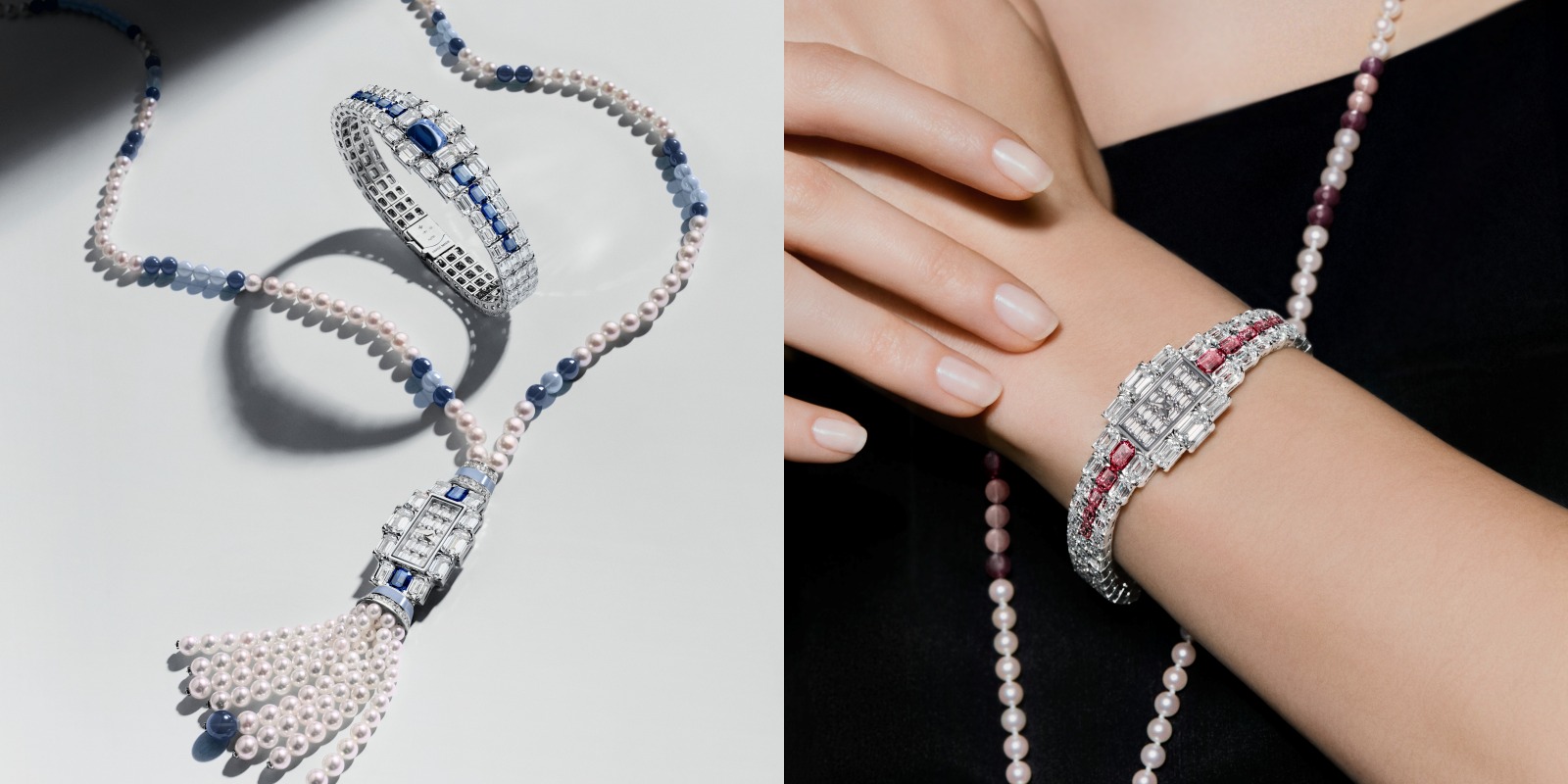新款Grand Lady Kalla高级珠宝时计由四个可快速替换的部分构成。其中,表链、腕表和珠宝吊坠采用利落的几何线条设计,与长项链的优雅曲线和谐相融,彰显装饰艺术风格的美学精髓。三款新作均镶嵌总重约45.66克拉的晶莹钻石,分别搭配蓝宝石、红宝石和祖母绿。“Rivière”风格三排式表链精心缀饰103颗钻石,中央一排镶嵌8颗珍稀彩色宝石。珠宝吊坠饰以12颗钻石,中央镶嵌1颗硕大的糖塔切割蓝宝石、红宝石或祖母绿,所有彩色宝石均经过瑞士珠宝研究院(SSEF)认证。腕表的表盘上满镶璀璨钻石,外圈环绕2颗祖母绿式切割彩色宝石和10颗祖母绿式切割钻石,宝石的绚丽光华与钻石的冷冽火彩构成醒目对比。腕表和珠宝吊坠均可固定于表链或长项链上,呈现出浑然一体的视觉效果。项链长度为85厘米,饰有112颗圆润饱满、光泽熠熠的Akoya珍珠,其间点缀以珍贵宝石和装饰宝石制成的抛光圆珠。纤长的项链末端坠以精美的珍珠流苏,并以1颗悉心抛光的珍贵宝石圆珠作为点睛。